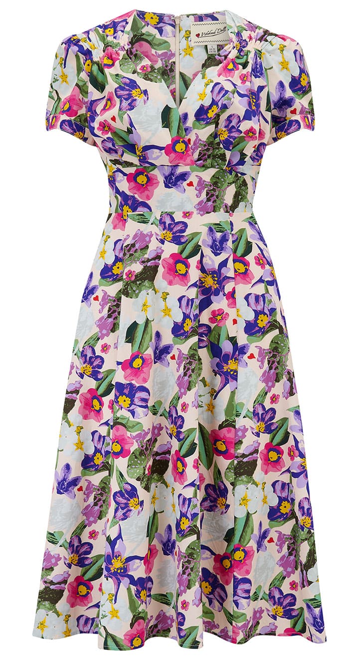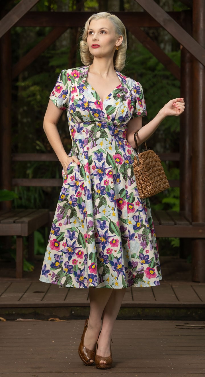 Recreate the charm and elegance of vintage fashion with this beautiful 1940s-inspired sweetheart neckline dress, made from 100% organic cotton! Featuring a stunning tropical print exclusively designed by us, this dress is perfect for both daytime outings and special occasions. The romantic sweetheart neckline, gathered yoke detail, and wide waistband work together to create a flattering feminine silhouette.