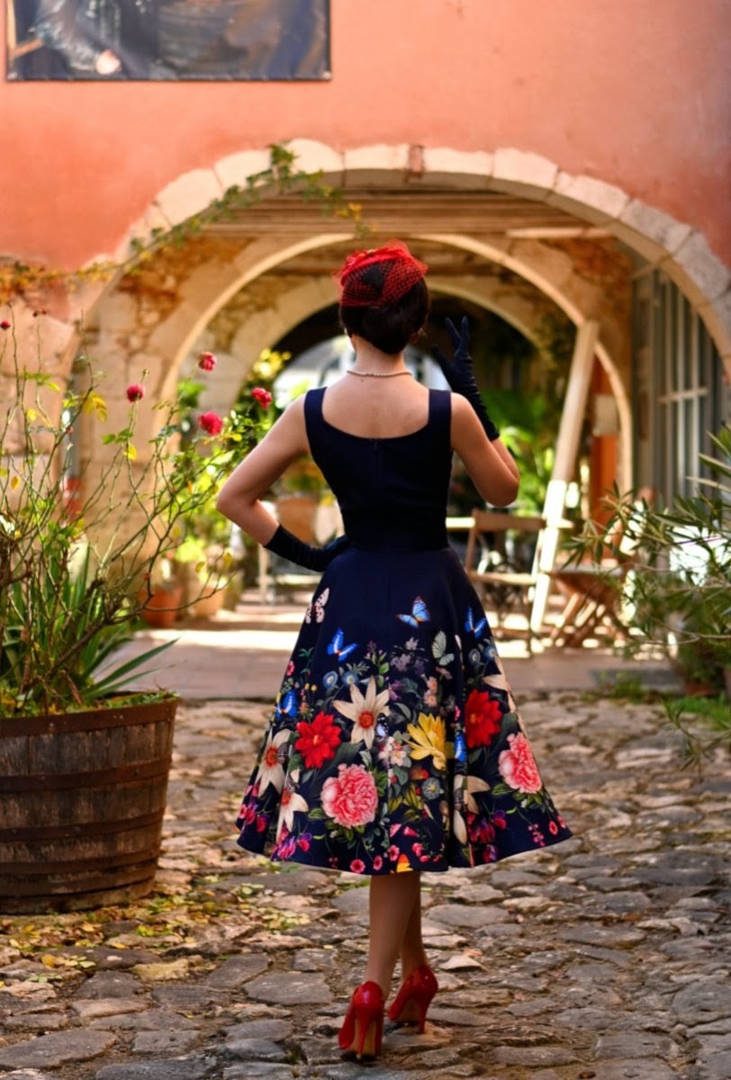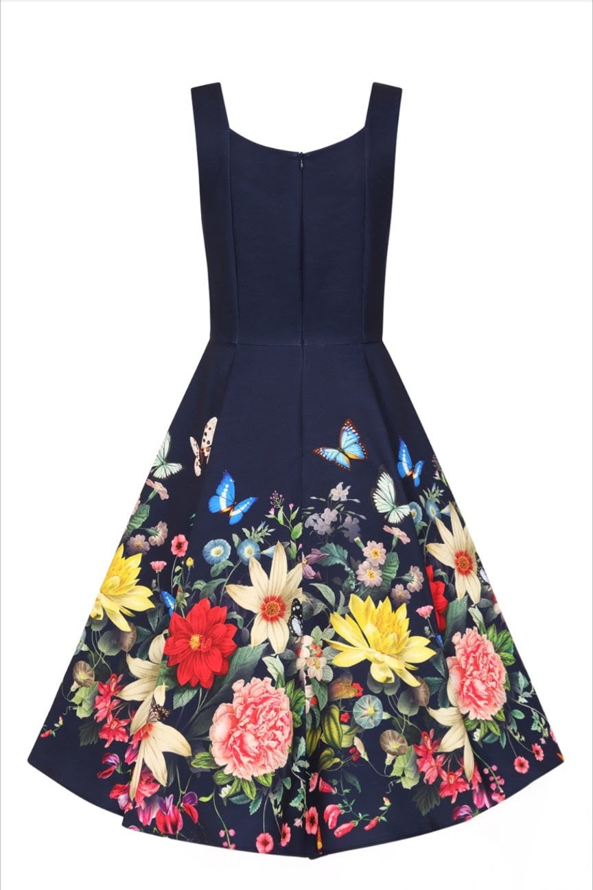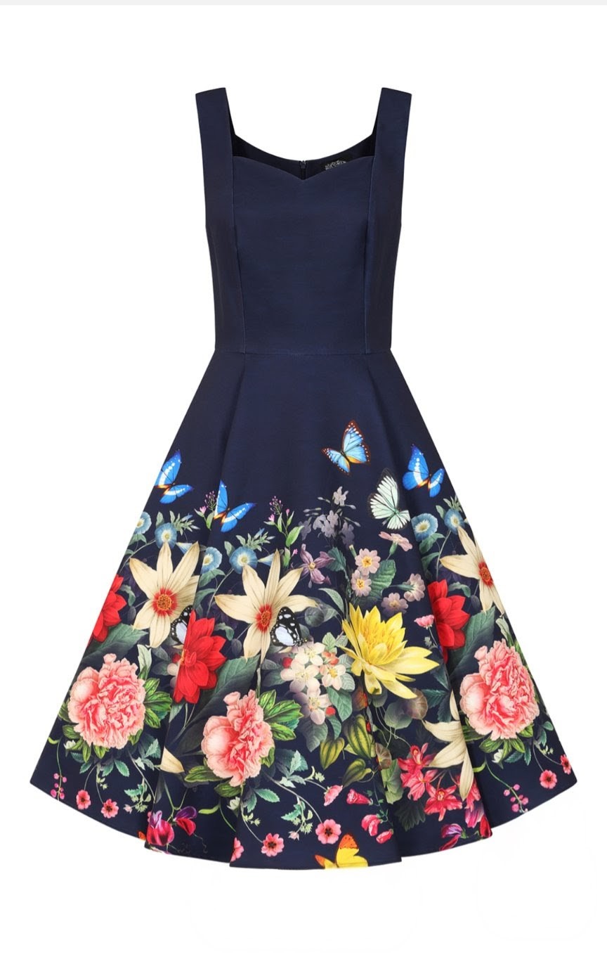 Dreamy, enchanting, and beautifully feminine, the Forever Love Swing Dress captures the magic of a twilight garden in full bloom. With its deep navy bodice and vibrant floral border, this dress brings together romance and elegance in a striking vintage-inspired silhouette. Playful butterflies flutter among bright blossoms, from ruby red florals to golden petals, creating a print that feels alive with movement and colour. The structured bodice features wide, supportive straps and a soft sweetheart neckline, offering a flattering, secure fit that enhances the natural waist. Flowing into a full 1950s-style swing skirt, the design offers graceful movement and the classic Hearts & Roses London hourglass shape. Crafted from our classic cotton fabric, the Forever Love Swing Dress transitions effortlessly from daytime charm to evening elegance, making it a captivating wardrobe favourite.