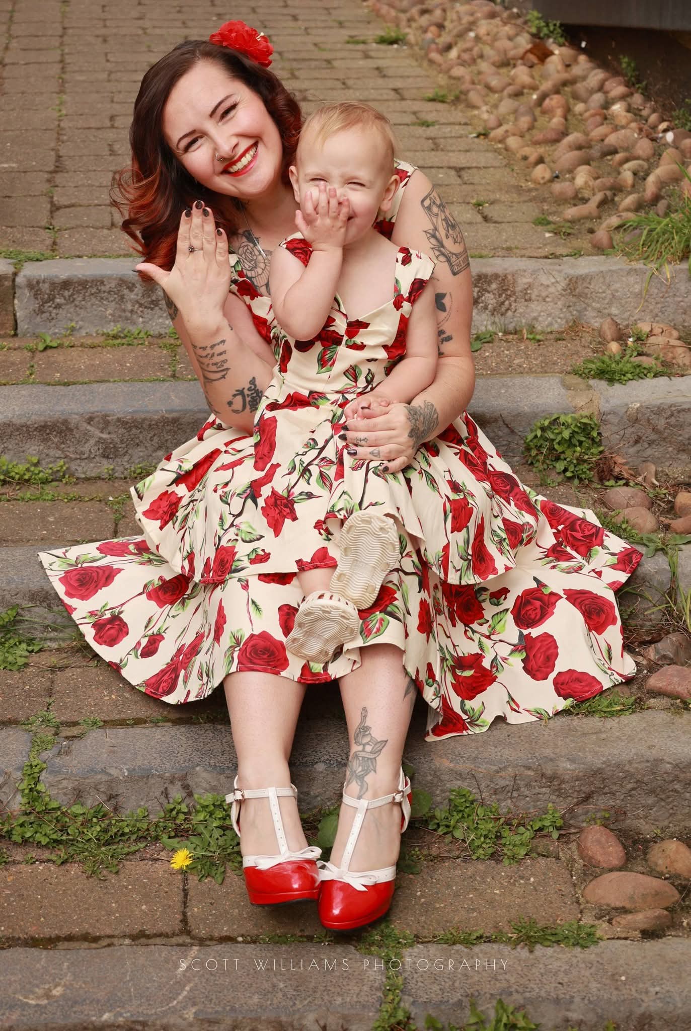 The Mini Betty-Rose is a beautiful floral spring/summer dress with a vibrant mix of red Roses with a touch green leaves against a off-white background.