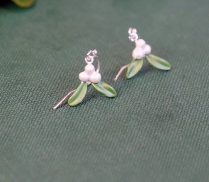 Mistletoe silver tone dangly earrings, with hand enamelled white berries and green leaves.