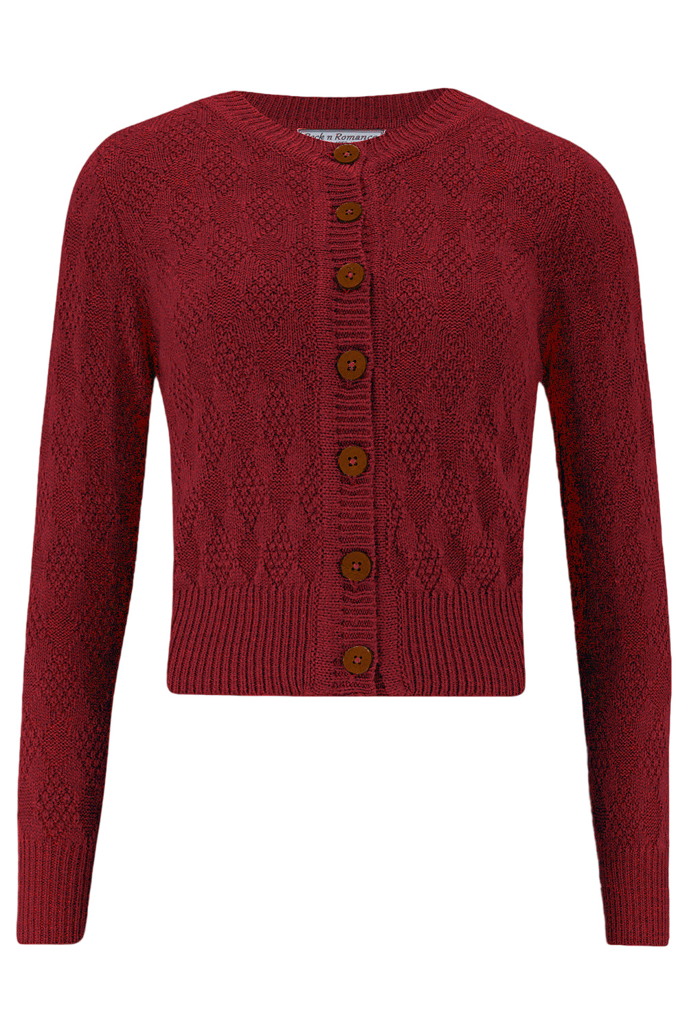 A sensational little textured diamond knit cardigan that can be warn easily with any casual 1940s or 50s look.. Equally at home with a pair of comfy jeans and a pair of flats for a really relaxed style..