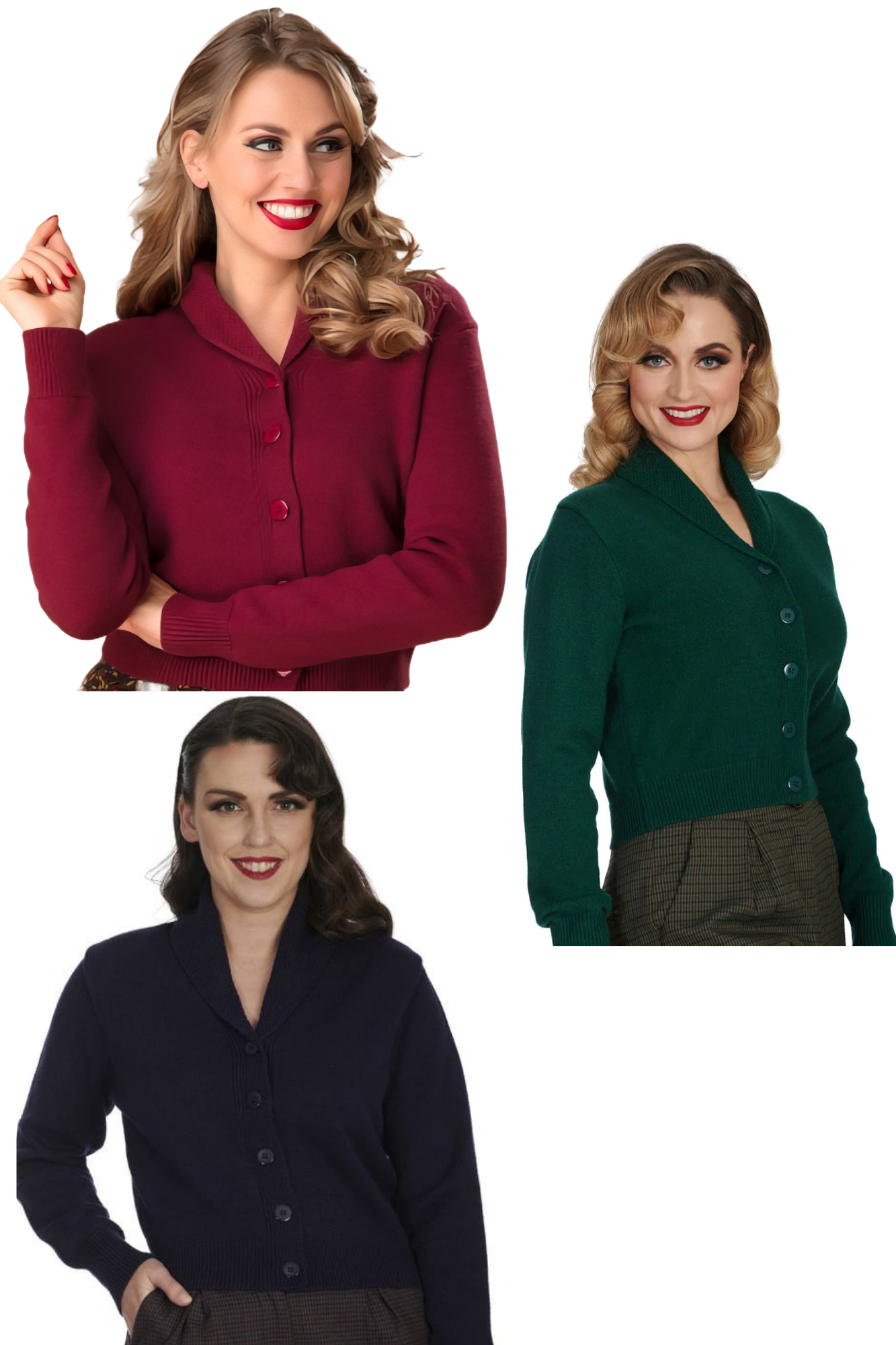1940/50's cropped cardigan, retro shawl collar, rib cuff for comfort, hem ribbed for great fit.