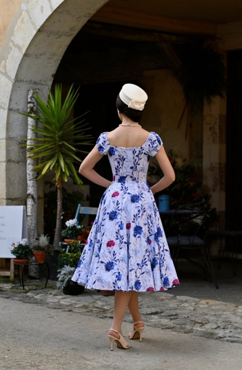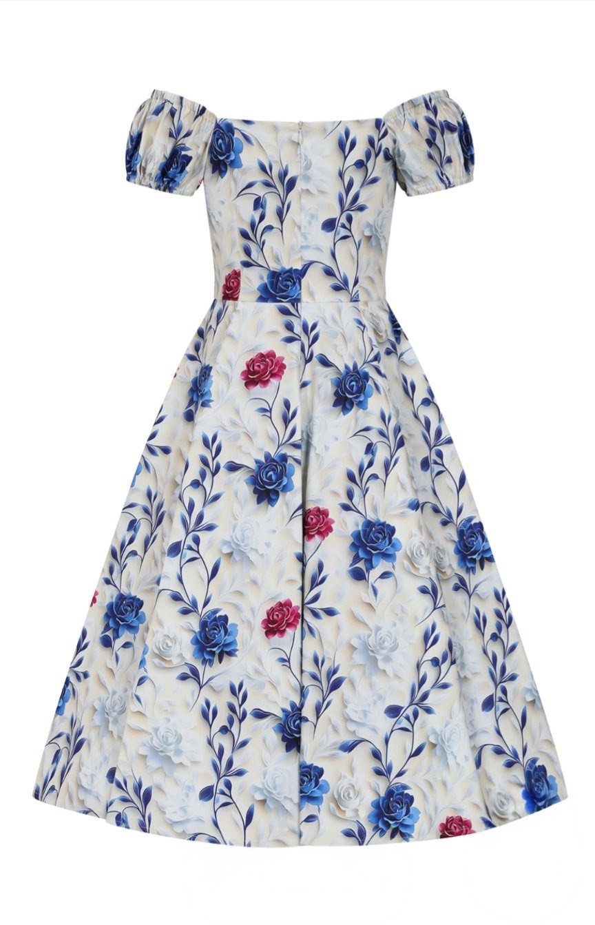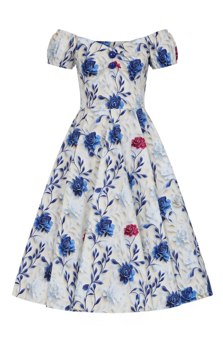 Soft, romantic, and beautifully timeless, the Wildflower Swing Dress brings a touch of countryside elegance to an enchanting vintage silhouette. Set on a gentle ivory backdrop, the dress is adorned with sweeping cobalt blossoms and delicate berry accents, creating a striking floral print that feels both classic and fresh. The off-shoulder neckline with softly gathered sleeves adds a graceful, feminine touch, framing the shoulders with effortless charm. A fitted bodice shapes the waist before falling into a full 1950s style swing skirt, offering beautiful movement and the signature Hearts & Roses London hourglass silhouette. Crafted from our cotton fabric, the Wildflower Swing Dress is perfect for warm days, garden gatherings, and any moment that calls for a romantic vintage flourish.