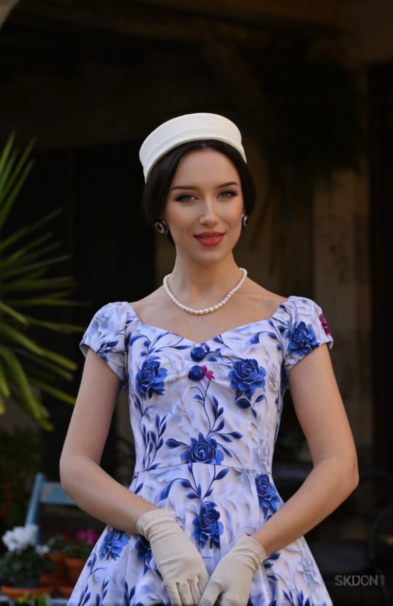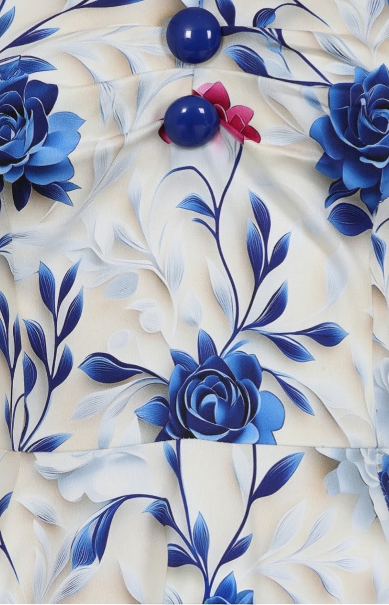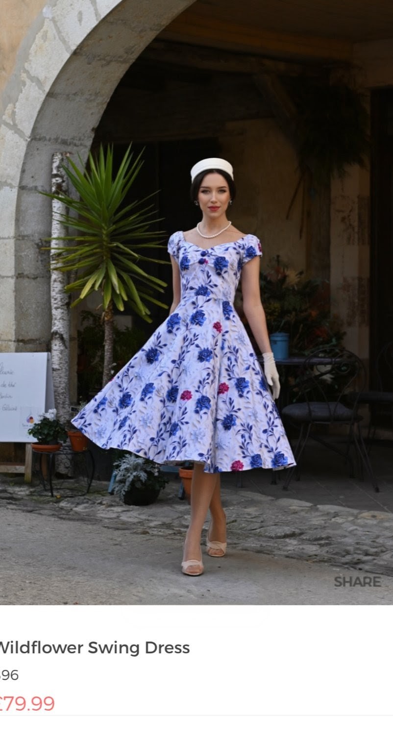 Soft, romantic, and beautifully timeless, the Wildflower Swing Dress brings a touch of countryside elegance to an enchanting vintage silhouette. Set on a gentle ivory backdrop, the dress is adorned with sweeping cobalt blossoms and delicate berry accents, creating a striking floral print that feels both classic and fresh. The off-shoulder neckline with softly gathered sleeves adds a graceful, feminine touch, framing the shoulders with effortless charm. A fitted bodice shapes the waist before falling into a full 1950s style swing skirt, offering beautiful movement and the signature Hearts & Roses London hourglass silhouette. Crafted from our cotton fabric, the Wildflower Swing Dress is perfect for warm days, garden gatherings, and any moment that calls for a romantic vintage flourish.